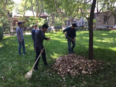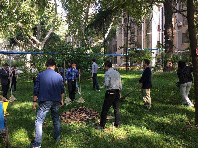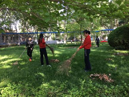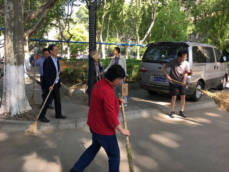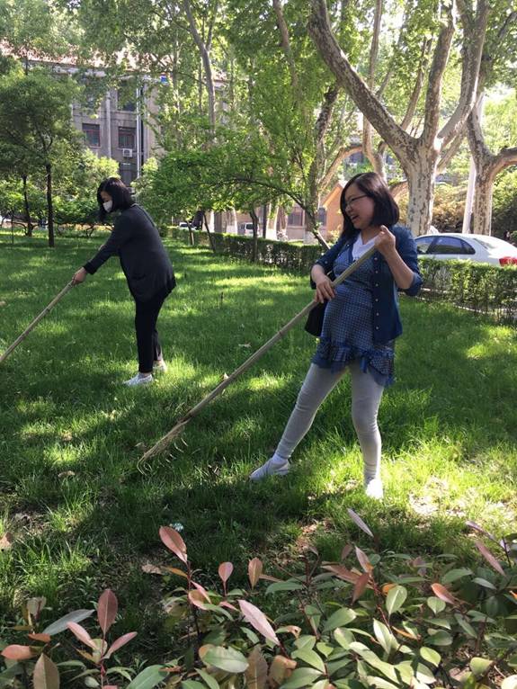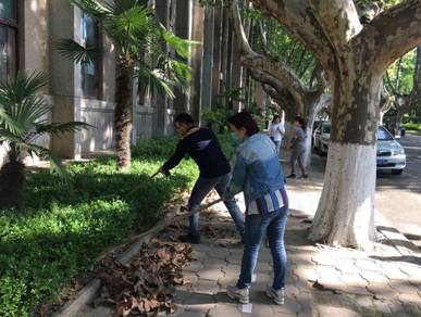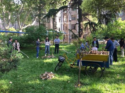 4月28日下午4:00,学院各系工会小组长在陆定一校友爱国爱校校训前进行集合,分发卫生劳动工具,来到东二楼西面和北面中间门洞以西的卫生包干区内进行大扫除工作。在党委马晓彬书记和社会学系、哲学系、中文系、传播学系、艺术系、中国书法系、音乐教育中心和社会心理学研究所等8个系主任、支部书记的带领下,60多名教职员工齐上阵,大家手持耙子或扫帚,将绿花带、草坪以及小竹林中的落叶等垃圾清理出来。