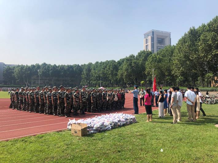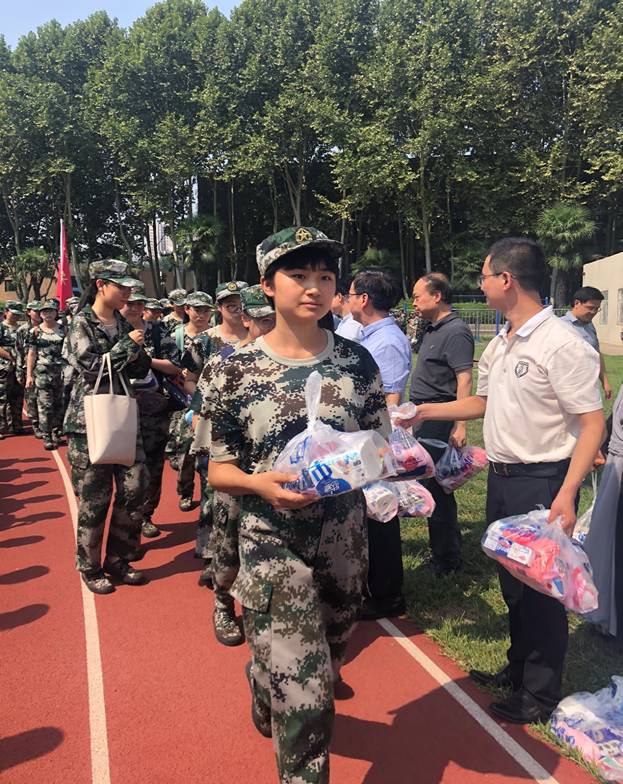 领导、各系老师及班主任发放新生军训慰问品