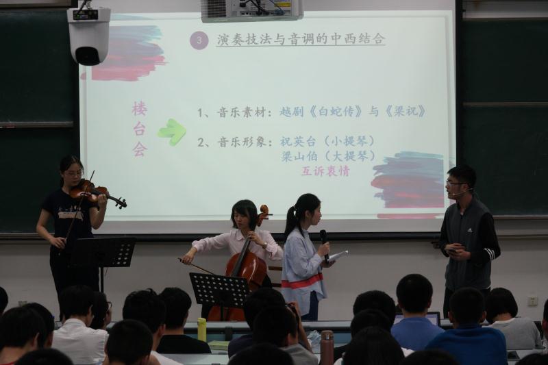 再次闪亮登场。本次课程的主题是“小提琴协奏曲《梁山伯与祝英台》民族化因素的解析与欣赏”。主讲教师文茹老师对这次见面课进行了精心的设计,以课程讲述、现场演奏、主题学唱、情景再现的师生互动方式进行授课。本次见面课既有内涵而又生动活波的授课方式激起了学生们极大地兴趣和参与的热情。