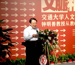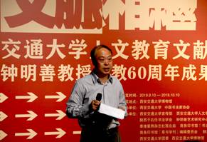 人文社会科学学院院长李黎明表示,新时期人文社会科学学科经过不懈努力成绩喜人,面对成绩更需饮水思源,牢记交通大学人文教育传统,续写交大文脉辉煌。钟明善教授从教六十年始终坚守“课大如天”,既是立德树人的师德楷模,也通过建设书法选修课、筹建书法专业本、硕、博完整培养体系等具体工作,开拓新时期交通大学人文艺术学科建设,更著书立说,以研究方法、治学理念及学术视野影响后继学人,堪称领路先锋;更谈及每每来到由钟教授负责筹建并捐赠了数千件珍贵文物的校博物馆都对先生为交大文化事业所做卓越贡献感佩不已。