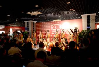上午10时,由大唐芙蓉园东仓鼓乐社带来世界非物质文化遗产西安鼓乐表演,乐器精良,阵容庞大,演绎出盛唐时期的恢弘乐音。在成人直播