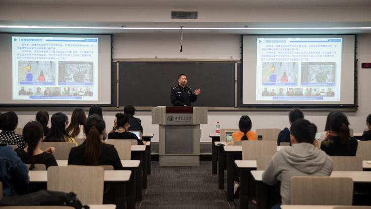 常帅老师以校园治安案件防范、关注国家安全、校园消防安全和其他安全问题等四个方面为切入点,与新生进行安全教育讨论。他通过列举我校真实案例、播放真实视频等方式,告知同学们隐患就在身边,需要时刻警惕各类安全问题。常老师重点介绍了创新港校区与周边治安环境、港区内部安防力量和安全防范措施,使同学们更加清晰的了解了创新港的安防措施。