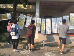 2019年9月28日下午,通识类选修课“书法基础”学生优秀结课作业汇报展在兴庆校区东花园长廊举办,展出2018-2019学年东、西校区来自多个学科的非专业学生所创优秀书法作品,用书香墨韵为建国70周年献礼。