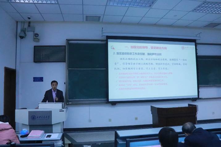 副院长张勇、王伟、张顺以及党委副书记王劲依次就分管工作及个人廉政情况分别作了总结和展望。张勇副院长就研究生教学和学科建设进行了总结反思,2019年学院研究生招生、培养、论文发表、国际化等工作稳中向好,创新港研究生教学工作有序开展,学生学习及生活情况良好,学院学科排名整体上升。王伟副院长对分管的科研及创新港工作进行了总结,2019年我院教师获批国家级项目7项,国家社科、自科项目均有斩获,艺术学科教师实现国社科和教育部项目双突破,荣获陕西省第十四次哲学社会科学优秀成果奖8项,奖项等级有所提升;创新港硬件及内涵建设双管齐下,均取得了令人满意的成绩。张顺副院长就本科生教学工作进行了回顾总结,2019年学院本科教育工作硕果累累,教学成果、教学获奖再创佳绩,本科生国际交流工作稳步推进。党委副书记王劲就基层党建及学生工作进行汇报,学院2019通过开展真人图书馆活动、思源讲书堂讲座等活动,为推动“思想交大”建设、活跃校园文化氛围注入活力。此外,重点建设“人文交大”微信公众平台,在学院营造了积极向上的良好氛围,也在学校产生了很好的反响。