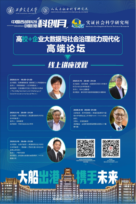 2020年9月13日,人文与社会科学研究院、实证社会科学研究所举办的科创月社会学系列活动——“高校+企业:大数据与社会治理能力现代化高端论坛”在中国西部科技创新港隆重开幕。社会学系全体教师、成人直播