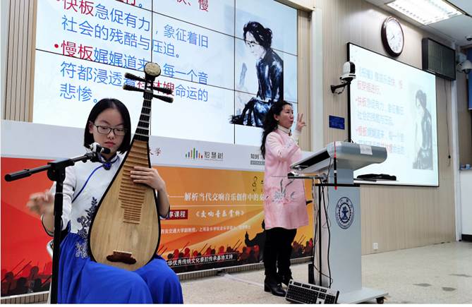 为了帮助同学们深入理解琵琶演奏技法、演奏个性与交响音乐表达之间的关系,西交大的自动化专业大四的刘玥莹同学,作为工科拔尖素养与艺术表现涵养兼备的优秀在校生代表,现场为同学们示范了琵琶左右手常用的演奏技巧,并且和曹耿献老师一起解读了赵季平创作的琵琶协奏曲《祝福》中的“悲愤与挣扎”。